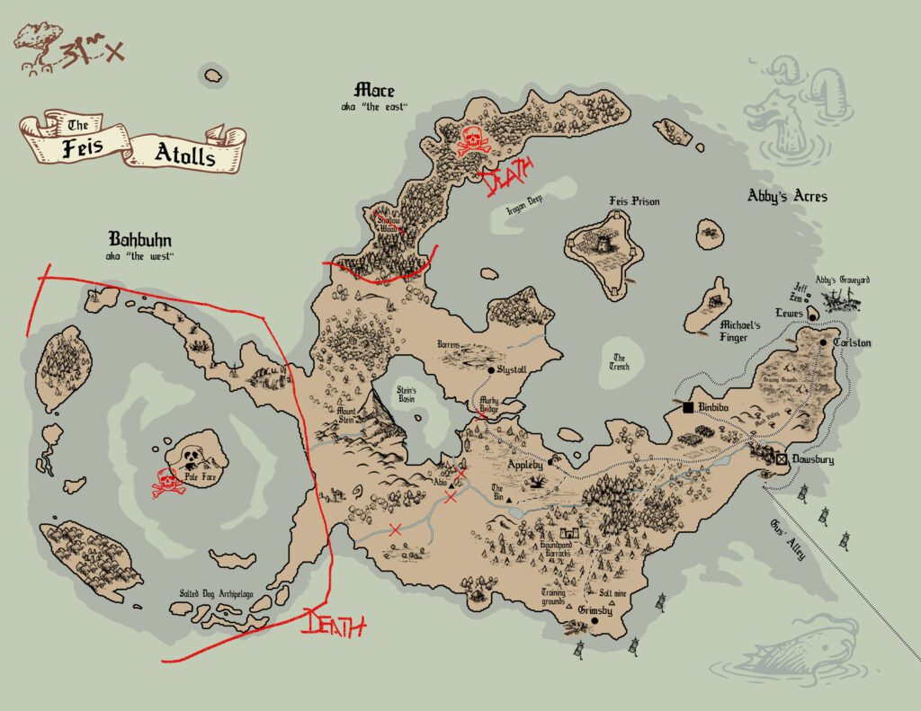 What's pictured here is a literal map of the Feis Atolls that the Player Characters (PCs) have given to them by a guard as they get off a boat in the town of Binbibo, arriving on the Atolls. Most of the places are actually just placeholders for DM's Guild or Yawning Portal events or adventures.